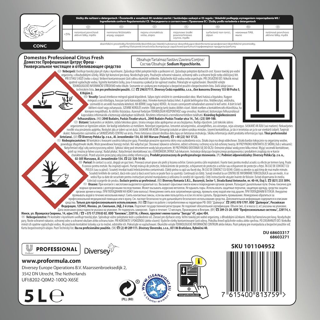 Domestos Professional Detergent Lichid Dezinfectant Zilnic Citrus Fresh 5 L este soluția profesională ideală pentru curățarea și dezinfectarea zilnică a suprafețelor din spații cu trafic intens. Formula sa eficientă elimină murdăria, bacteriile și mirosurile neplăcute, lăsând în urmă un parfum proaspăt de citrice. Recomandat pentru utilizare în HoReCa, instituții publice, unități medicale, birouri și spații comerciale.